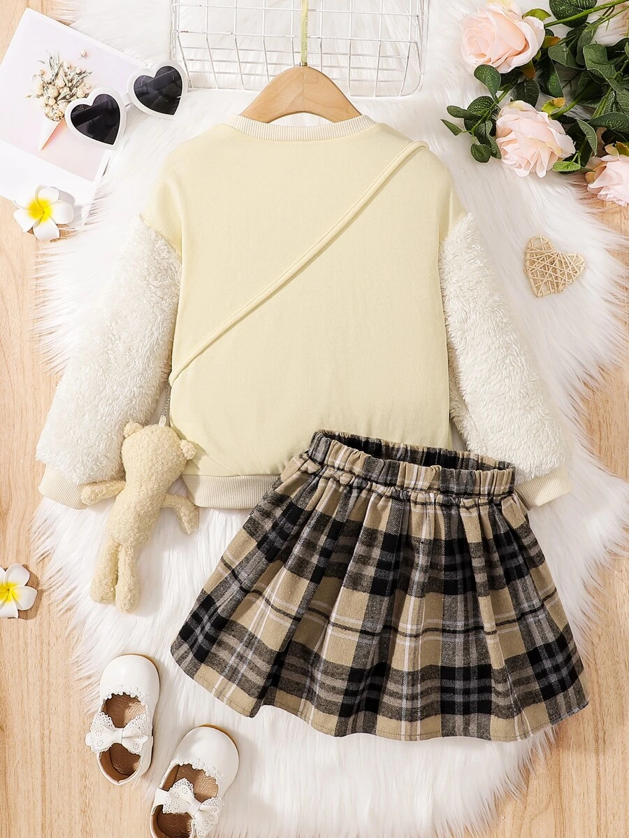 เสื้อสวมหัว เด็กเล็กผู้หญิง ปักลายหัวใจ แขนขนฟู และ กระโปรง ลายแพลต ทรงบาน และ กระเป๋า ลายหมี a-39