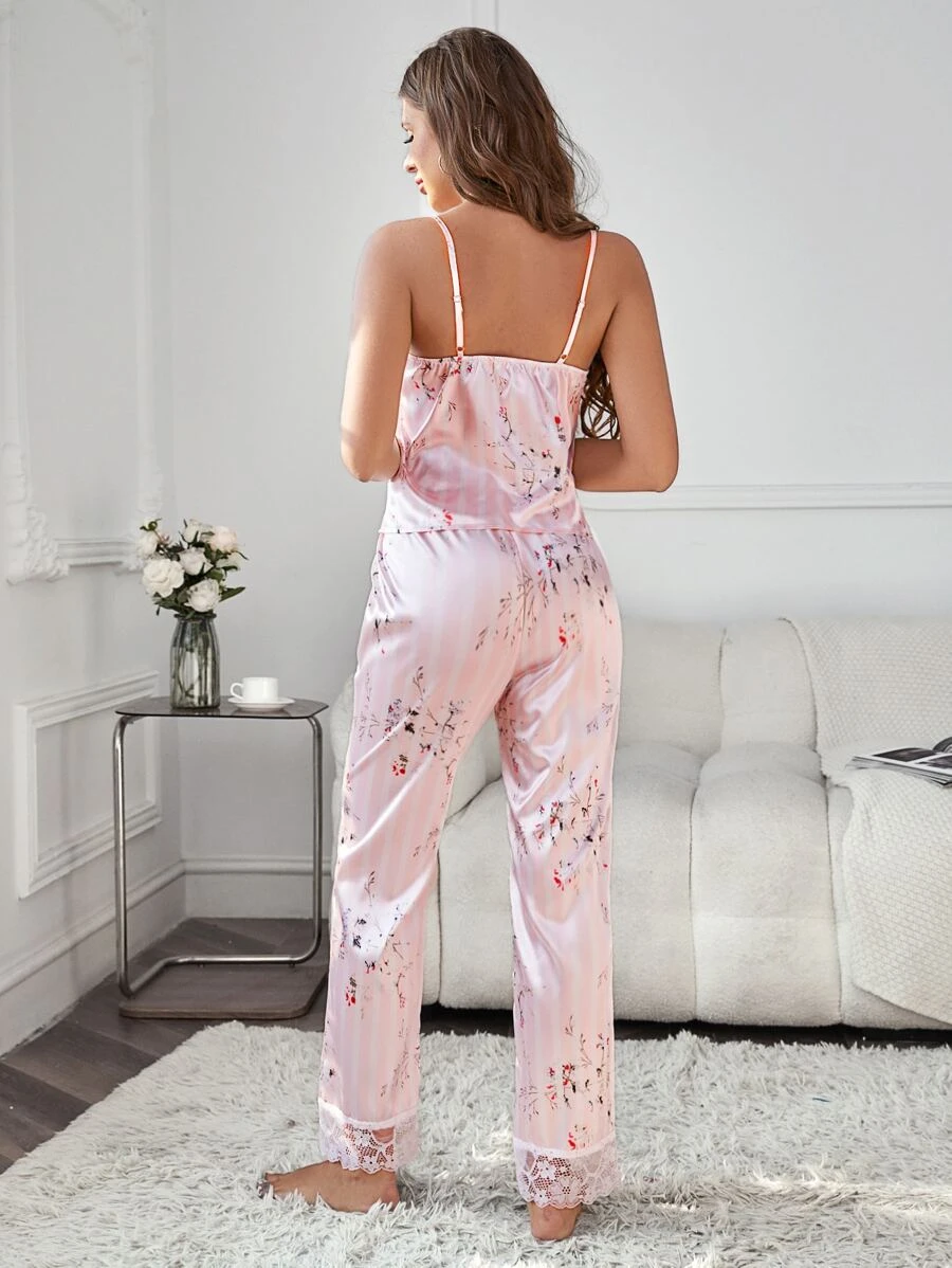 เซ็ต ชุดนอน ลายทางแนวตั้ง & พิมพ์ลาย ดอกไม้ ขอบลูกไม้ ผ้าซาติน bb-58