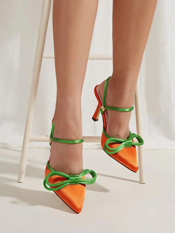 รองเท้าส้นสูง ผ้าซาติน ทูโทน ตกแต่ง โบว์ ทรงหัวแหลม กริช สลิงแบ็ก l-82