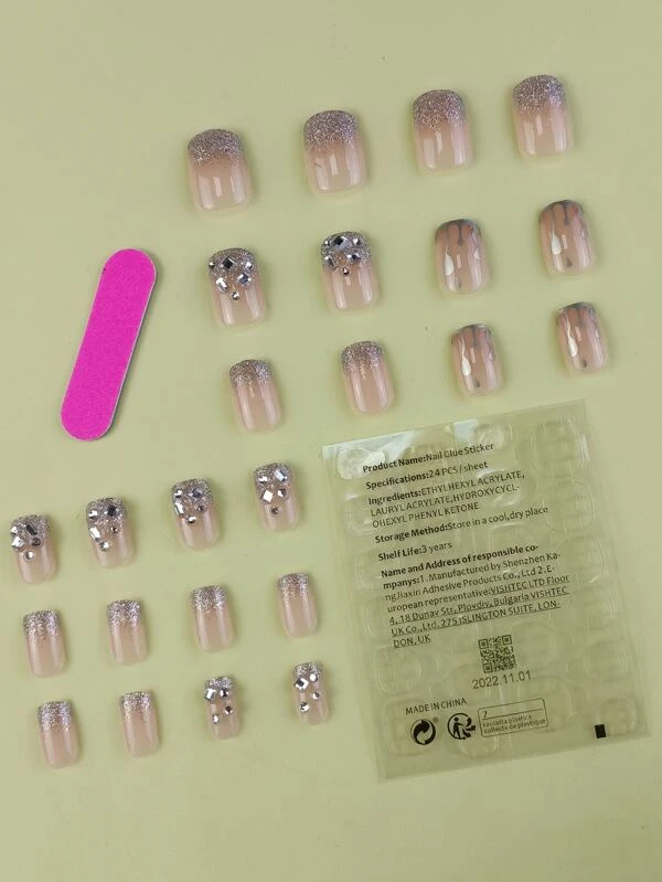 เล็บปลอม ยาว สี่เหลี่ยม ตกแต่ง พลอยเทียม & เทปกาว 1 แผ่น & ตะไบเล็บ 1 ชิ้น 24 ชิ้น แ-93