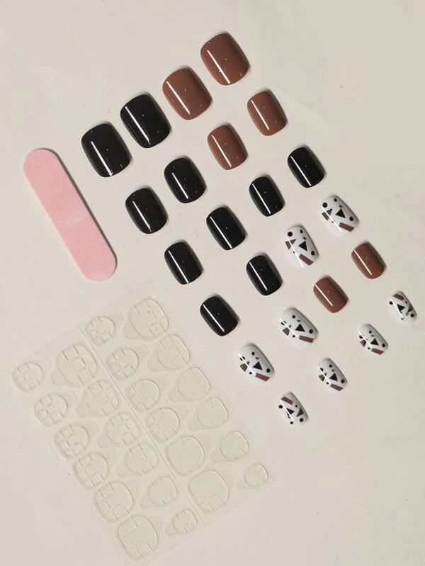 เล็บปลอม สั้น สี่เหลี่ยม ลวดลาย เรขาคณิต & ตะไบเล็บ 1 ชิ้น & เทปติดเล็บ 1 แผ่น 24 ชิ้น c-44