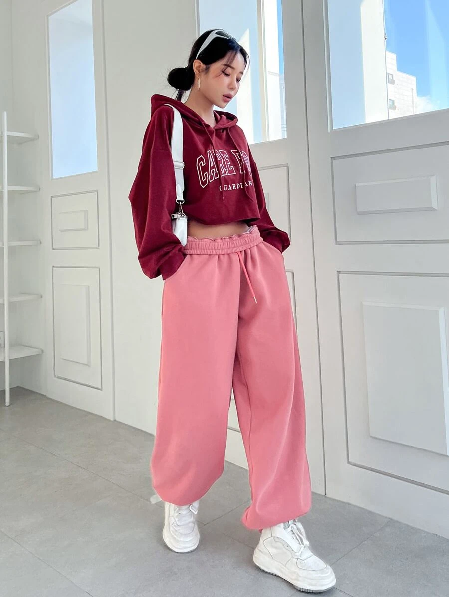 เสื้อฮู้ด ครอป กราฟฟิค ตัวอักษร ไหล่ตก เชือกรูด cc-25