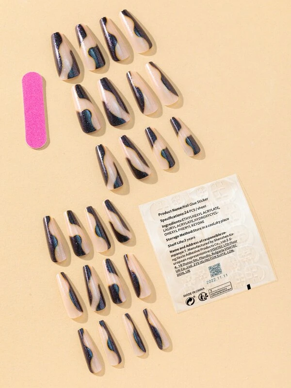 เล็บปลอม ยาว คอฟฟิน ลายดาว & เทปกาว 1 แผ่น & ตะไบเล็บ 1 ชิ้น 24 ชิ้น c-91