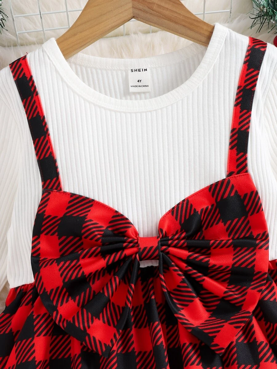 เดรส เด็กเล็กผู้หญิง ลายคริสต์มาส และ ลายกิงแฮม แต่งโบว์หน้า 2 in 1 a-11