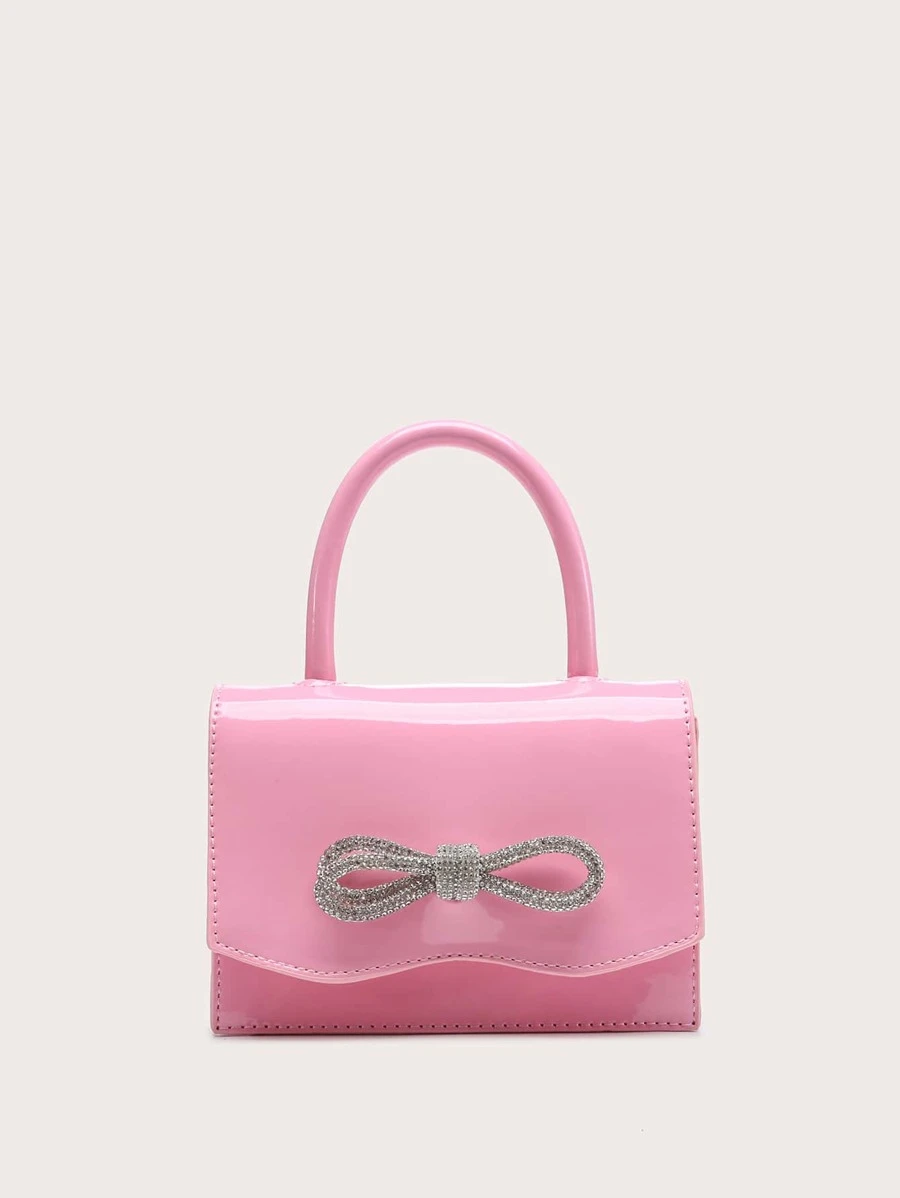 กระเป๋าสี่เหลี่ยม มินิ ตกแต่ง พลอยเทียม & โบว์ Flap หนังสิทธิบัตรเทียม v-87