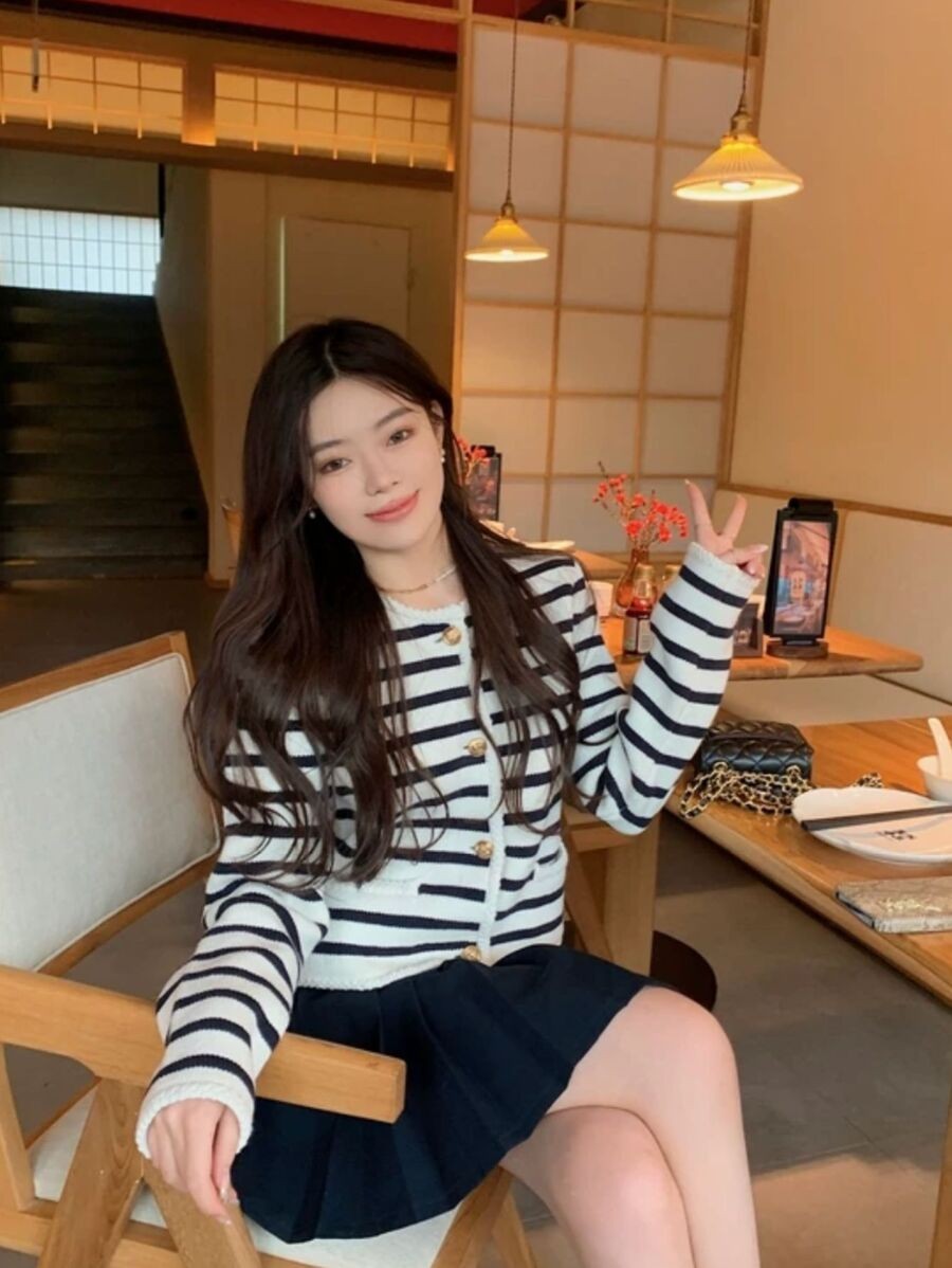 คาร์ดิแกนไหมพรม ลายริ้วซิกเนอร์เจอร์ ดีเทลกุ้ยขอบ กระดุมทองหรูหรา มีกระเป๋าหลอก i-27