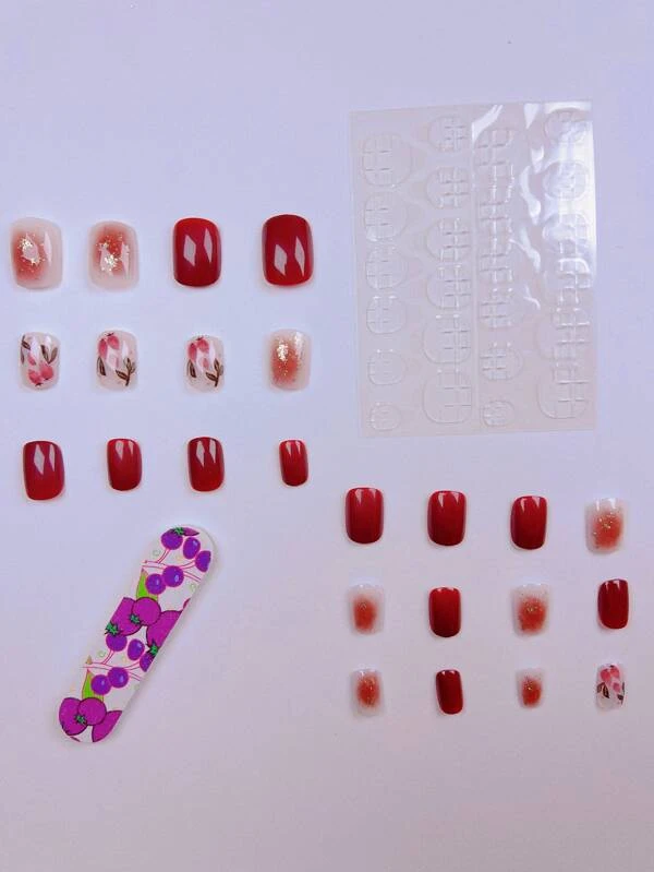 เล็บปลอม สั้น สี่เหลี่ยม พิมพ์ลาย ดอกไม้ 24 ชิ้น & เทปกาว 1 แผ่น & ตะไบเล็บ 1 ชิ้น c-22