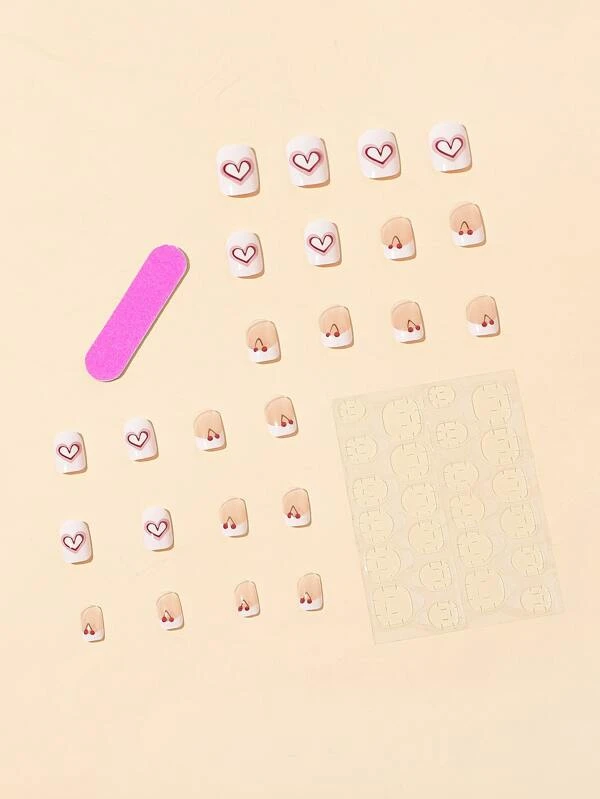 เล็บปลอม สั้น สี่เหลี่ยม ลาย หัวใจ 24 ชิ้น & เทปกาว 1 แผ่น & ตะไบเล็บ 1 ชิ้น c-4