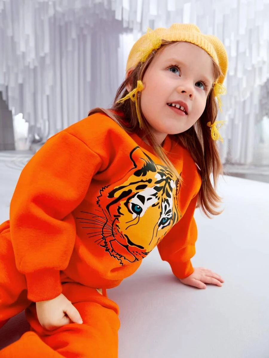 เด็กผู้หญิง เสื้อสวมหัว ส้มนีออน ลาย เสือ a-50