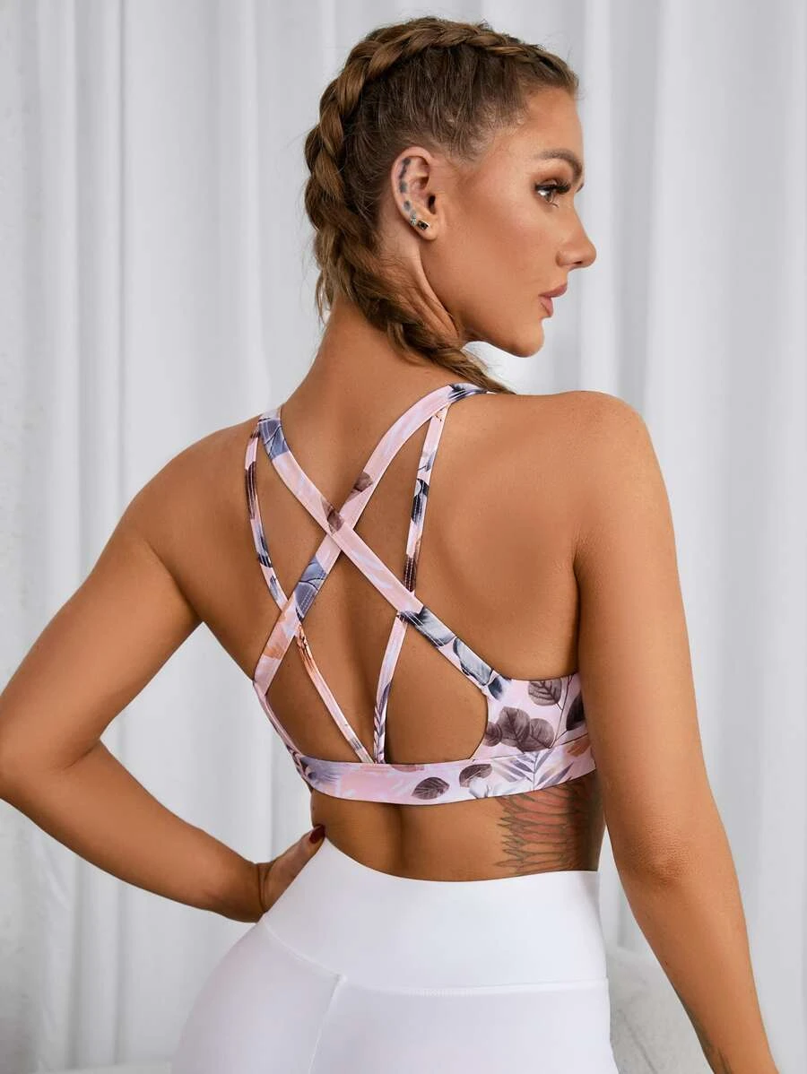 สปอร์ตบรา พิมพ์ ทรอปิคอล เปิดหลังแบบมีสายไขว้ aa-18