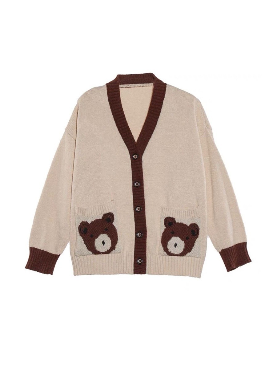 คาร์ดิแกนไหมพรมทรงโอเวอร์ไซส์ ทอลายหน้าหมีสุดคิ้ว ตัวใส่ง่าย คลุมสะดวก i-19