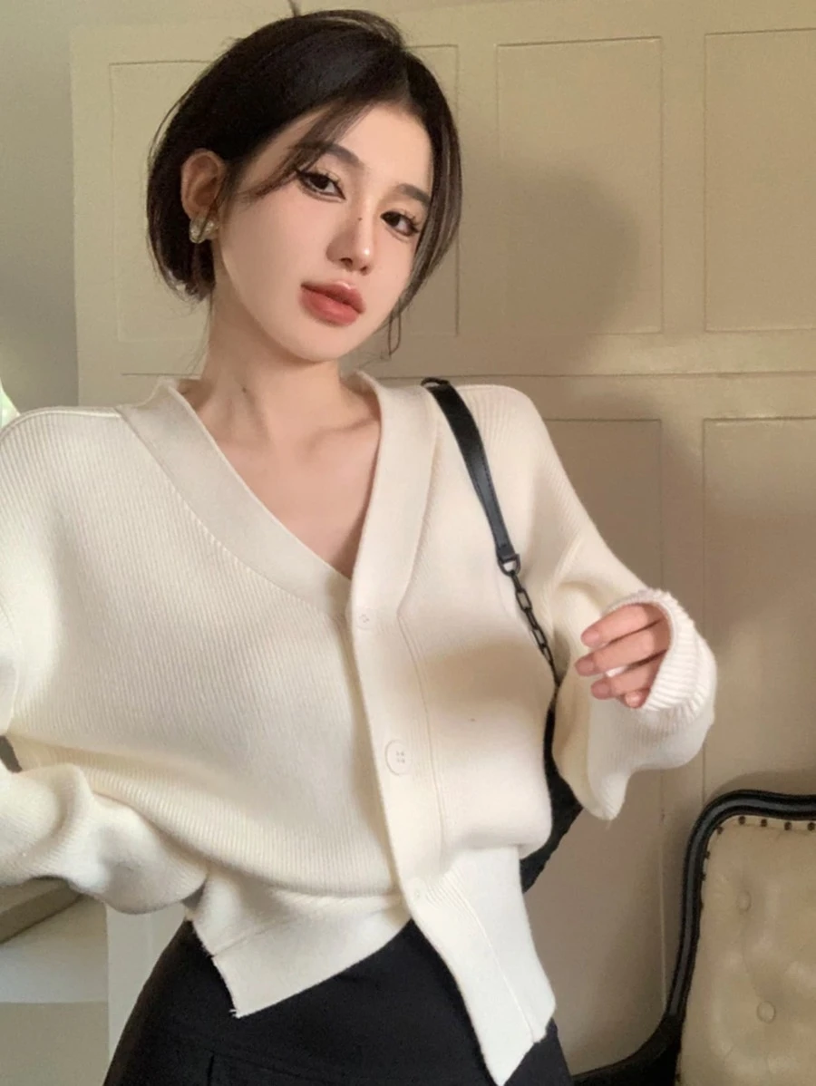 เสื้อคาร์ดิแกน ครอป สีพื้น ไหล่ตก กระดุมด้านหน้า i-63