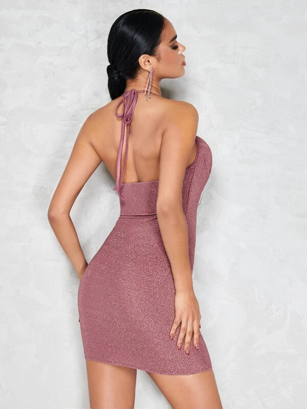 ชุดเดรสปักเลื่อม พลอยเทียม เดรปหน้า คล้องคอ d-64
