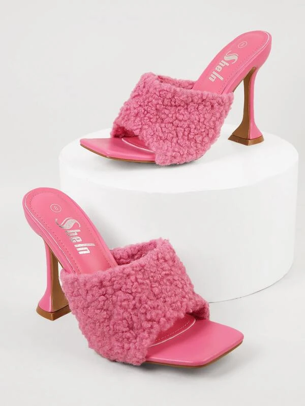 รองเท้าส้นสูง สายแต่งขน หัวเหลี่ยม เปลือยหลัง l-103