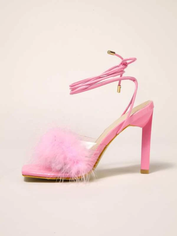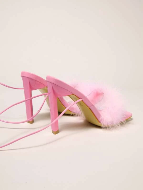 รองเท้าแตะ แต่งขน ส้นเข็ม แต่งสาย l-96