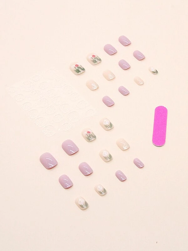 เล็บปลอม พิมพ์ ลายดอกไม้ 24 ชิ้น & เทปกาว 1 แผ่น & ตะไบเล็บ 1 ชิ้น c-23