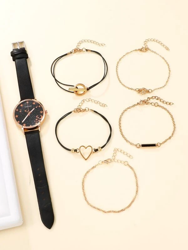 นาฬิกาข้อมือ เครื่องควอตซ์ 1 ชิ้น ลายดวงดาว และ ลายพระจันทร์ หน้าปัดกลม และ สร้อยคอ 5 ชิ้น น-0164