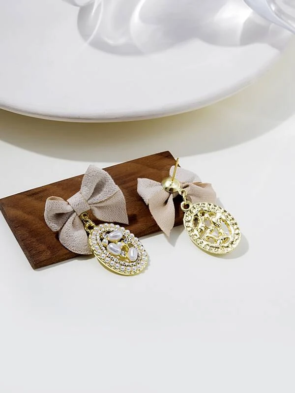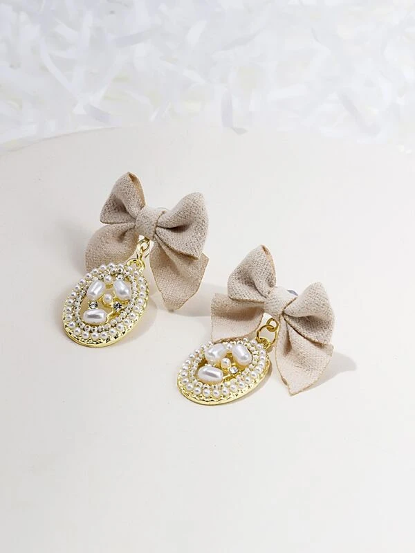 ต่างหูแบบยาว ประดับมุกและโบว์เทียม e-88