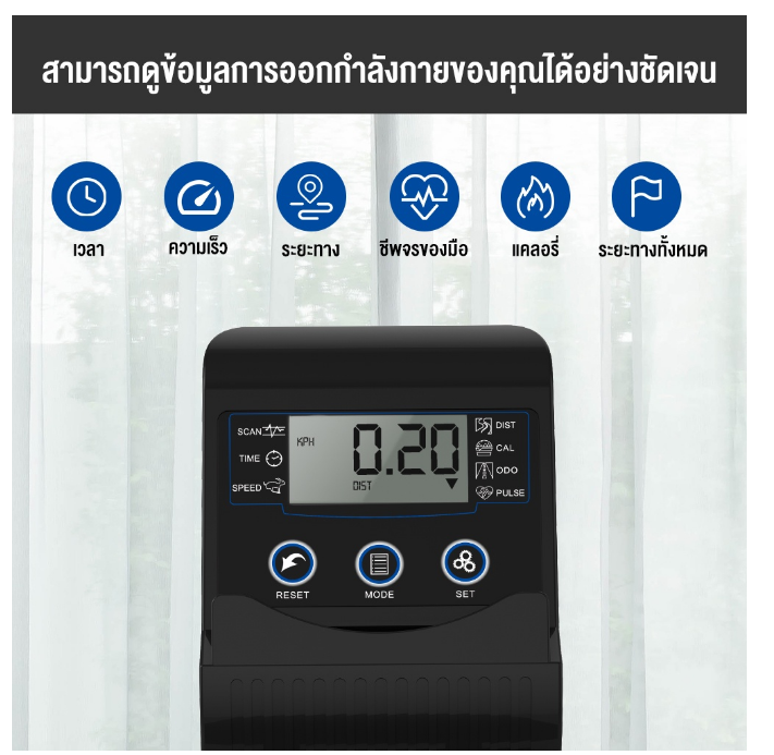 มาพร้อมหน้าจอแสดงผล เวลา, ระยะทาง, ระยะทางสะสม, ความเร็ว, แคลอรี่ และอัตราการเต็นของชีพจร