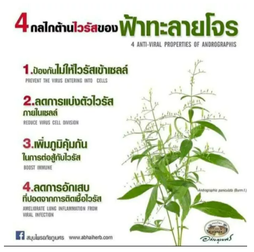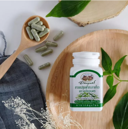 แคปซูลฟ้าทะลายโจร ตราอภัยภูเบศร 400 มก บรรจุ 60 แคปซูลฟ้าทะลายโจร Andrographis paniculata (Burm.f:)Nees สมุนไพรชนิดนี้ ทางโรงพยาบาลเจ้าพระยาอภัยภูเบศร ผู้ผลิตใช้ข้อมูลการศึกษาวิจัย จากที่มีการวิจัยไว้แล้ว ซึ่งมีข้อมูลยืนยันถึงความปลอดภัยและประสิทธิภาพ จึงได้พัฒนาให้อยู่ในรูปของแคปซูล ใช้เป็นทางเลือกในการรักษาอาการไอและเจ็บคอที่ไม่มีข้อบ่งชี้ว่าต้องใช้ยาปฏิชีวนะ,แก้ท้องเสียผู้ผลิต โรงพยาบาลเจ้าพระยาอภัยภูเบศร จ.ปราจีนบุรีส่วนประกอบ: ฟ้าทะลายโจรแห้ง สรรพคุณ: แก้ไข้วิธีใช้: สำหรับแก้ไข้ รับประทานครั้งละ 2-4 แคปซูล วันละ 4 ครั้ง หลังอาหารและก่อนนอนอายุผลิตภัณฑ์: 3 ปี (นับจากวันผลิต) ความแรง/ขนาดบรรจุ: 400 มิลลิกรัม/แคปซูล (60 แคปซูล/กระปุก)ประเภทยา: ยาสามัญประจำบ้านเลขทะเบียนที : G 512/60