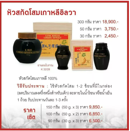 • หัวสกัดโสมเกาหลีเข้มข้น 100% ปริมาณสุทธิ 150กรัมผลิตจากรากโสมเกาหลี เกรด A อายุ 6 ปีใช้บำรุงสุขภาพช่วยป้องกันความอ่อนเพลียช่วยในการฟื้นตัวหลังอาการเจ็บป่วยรับประทานได้ทั้งเด็ก และผู้ใหญ่อิลวา โสมเกาหลี ชนิดหัวสกัด ผลิตจากรากโสมเกาหลี เกรด A อายุ 6 ปี ซึ่งอิลวา เป็นผู้ผลิตส่งออกรายใหญ่ที่สุดในเกาหลี ที่ได้รับโควต้าจากรัฐบาล และสมาคมปลูกโสมให้ส่งมอบรากโสมคุณภาพในจำนวนที่ต้องการก่อน บริษัทผู้ผลิตอื่นรากโสม จะผ่านกระบวนการล้างทำความสะอาด การบด และลำเลียงลงถังสกัดด้วยกรรมวิธีที่ เป็นเอกลักษณ์เฉพาะของอิลวา หลังจากนั้นก็เข้าสู่กระบวนการปั่นแยกสิ่งไม่บริสุทธิ์ออก เข้าสู่ กระบวนการตกตะกอน คุณภาพทั้งหมดจะถูกตรวจสอบโดยระบบคอมพิวเตอร์ที่ทันสมัยอย่างพิถีพิถัน ทุกขั้นตอน วิธีการสกัดโสม มีอยู่ 2 วิธี1.วิธีสกัดโดยใช้น้ำเป็นตัวสกัดเอาตัายาออกมา โดยต้มให้เดือดที่อุณหภูมิ 100 องศาเซลเซียส ซึ่งเป็นวิธีที่ใช้กันโดยทั่วไป แต่วิธีนี้ตัวยาบางตัวรวามทั้งกลิ่นและรสชาติจะถูกทำลายไป เนื่องจาก ใช้ความร้อนที่สูงมาก2.วิธีการสกัดโดยใช้ แอลกอฮอล์ เป็นตัวสกัดซึ่งใช้อุณหภูมิเพียง 60 องศาเซลเซียส เป็นวิธีที่ดีที่สุดและทันสมัยที่สุด โดยสามารถรักษาตัวยา กลิ่น และรสชาติของโสมไว้ได้อย่างสมบูรณ์ 100% แต่เป็นวิธีที่ใช้ค่าใช้จ่ายมากกว่าวิธีใช้น้ำสกัด “เพื่อคุณภาพที่เป็นหนึ่ง อิลวาใช้วิธีสกัดโดยแอลกอฮอล์ ภายใต้อุณหภูมิและแรงดันต่ำ” สรรพคุณ : โสมช่วยลดการปวดประจำเดือน