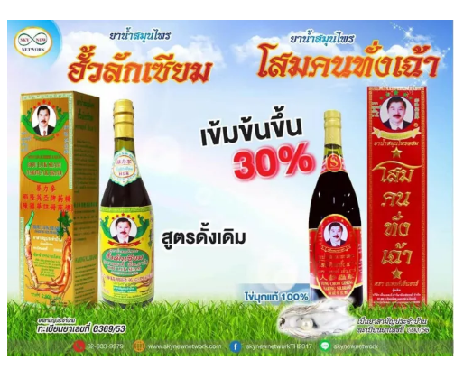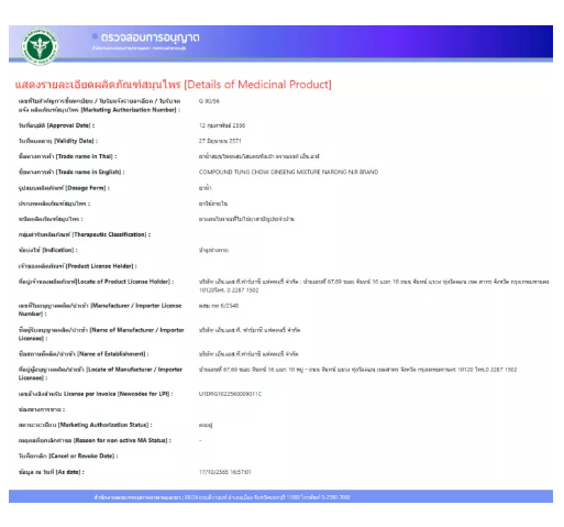 โสมคนทั่งเฉ้า ถั่งเช่าธิเบต (TUNG CHOW GINENG) ทะเบียน G 90/56 ขนาดบรรจุ 750 cc โสมคนทั่งเฉ้า จดทะเบียนเป็น ยาสามัญประจำบ้าน ยาแผ่นโบราณ ที่สกัดมาจากสมุนไพรชั้นดี 99 ชนิด ในขวดเดียวกัน และยังได้รับการตรวจสอบและจดทะเบียนรับรองจากสำนักงานอาหารและยา (อ.ย.) แล้วว่าไม่มีสารพิษใดๆ เจือปนไม่มีอันตรายและไม่มีโทษต่อร่างกาย คำเตือน เด็กและสตรีมีครรภ์ไม่ควรรับประทาน ควรกินอาหารให้ครบ 5 หมู่ ในสัดส่วนที่เหมาะสมเป็นประจำ ไม่มีผลในการป้องกันหรือรักษาโรค ไม่ใช่อาหารสำหรับควบคุมน้ำหนัก