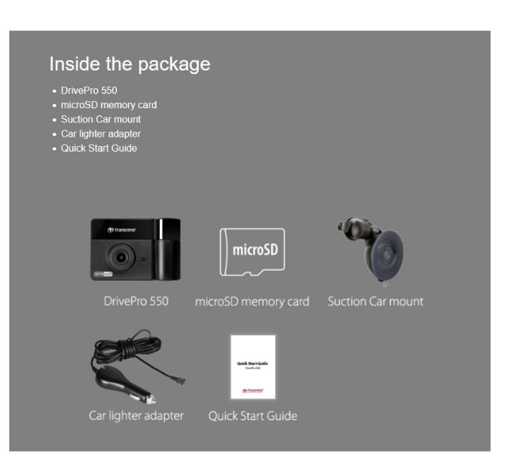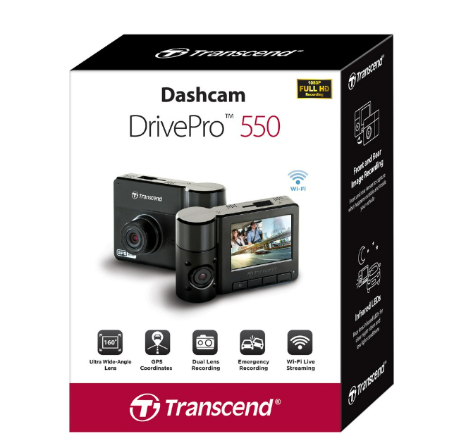 Transcend DrivePro 550 กล้องบันทึกวีดีโอติดรถ (TS-DP550B-64G) Sony high-sensitivity image sensor Dual lens camera Wi-Fi GPS/GNSS coordinates Lane Departure Warning System Forward Collision Warning System Head-up display Headlight reminder Driver fatigue alert Emergency recording Appearance Dimensions (Max.) 95.6 mm x 65.9 mm x 40.5 mm (3.76" x 2.59" x 1.59") Weight (Max.) 107 g (3.77 oz) Interface USB Type : micro USB Connection Interface : USB 2.0 Network Interface : Wi-Fi 802.11n Hardware Display : 2.4" color TFT LCD Viewing Angle for Lens 160° (diagonal) Viewing Angle for Rear Lens 110° (diagonal) Aperture : F/2.2 Aperture : (Rear) F/2.8 Operating Environment Operating Temperature -20°C (-4°F) ~ 65°C (149°F) Storage Temperature -25°C (-13°F) ~ 70°C (158°F) Input Voltage 12V ~ 24V Output Voltage 5V / 2A Note Do not operate the DrivePro dashcam while driving. If the lighter socket in your car continues to provide power after the engine is switched off, unplug the DrivePro when the engine is off or idling to reduce unnecessary power consumption and prevent malfunction. Format Resolution : Full HD 1080P Resolution (Rear) : HD 720P Frame Rate : 30 fps Video Format : MP4 (H.264) Warranty : Two-year Limited Warranty Warranty Policy Please click here for more information about the Transcend Warranty Policy. Transcend's warranty does not apply to the improper usage of product, including the following conditions: Use of a non-Transcend car adapter Product modifications Use of product in abnormal temperatures Package Package Contents Full unit/microSD memory card/Car mount/Car lighter adapter/Hardwire power cable/Warranty card/Quick Start Guide Note : Package contents (car mount, car lighter adapter, and hardwire power cable) depend on the model chosen. System Requirement Operating System Microsoft Windows 7 Microsoft Windows 8 Microsoft Windows 10 OS X Mountain Lion 10.8.2 or later Linux Kernel 2.6.38 or later Memory Card Supported 8 GB/16 GB/32 GB/64 GB/128 GB
