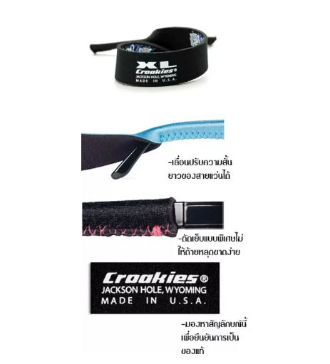 Made in USA -วัสดุทำมาจากยางยืดเทียม neoprene ที่มีคุณภาพดี -สามารถปรับให้สั้นหรือยาวได้ -ซักล้างได้ตามปกติ -พิมพ์สกรีนลายอย่างดี ให้ความชัดและสีสันสดใส -ตัดเย็บแบบพิเศษ ไม่ให้ด้ายหลุดขาดง่าย ขนาดความกว้าง 1 นิ้ว ยาว 16 นิ้ว ขนาดปลายขาแว่นทีจะใช้ต้องไม่เกิน 0.7-1.2 ซม Sublimated Print Croakies & XL come in detailed and colorful prints. FEATURES: - High quality neoprene - HyPUR-cel® - Adjustable - Colorfast & washable - Custom imprinting available "Screenprinted in crisp detail and bright colors" "พิมพ์สกรีน ให้ความละเอียด คมชัด สีสันสดใส"