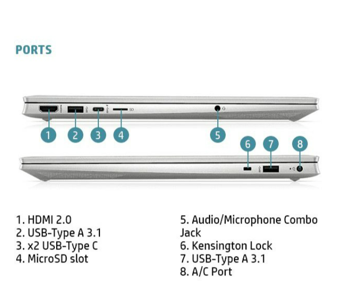 Port :1 USB 3.1 Gen 1 Type-C™ (Data Transfer Only, 5 Gb/s signaling rate); 2 USB 3.1 Gen 1 Type-A (Data Transfer Only); 1 AC smart pin; 1 HDMI 1.4b; 1 headphone/microphone combo