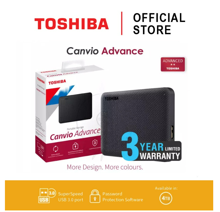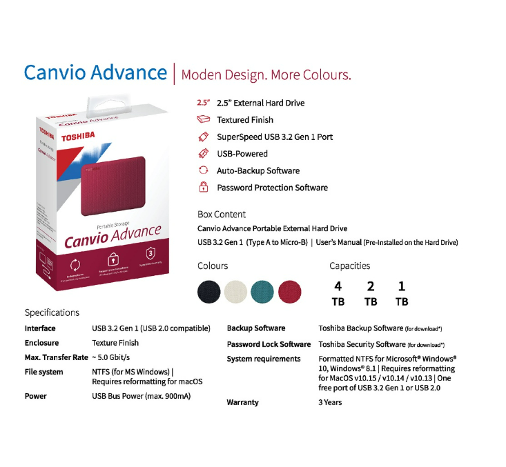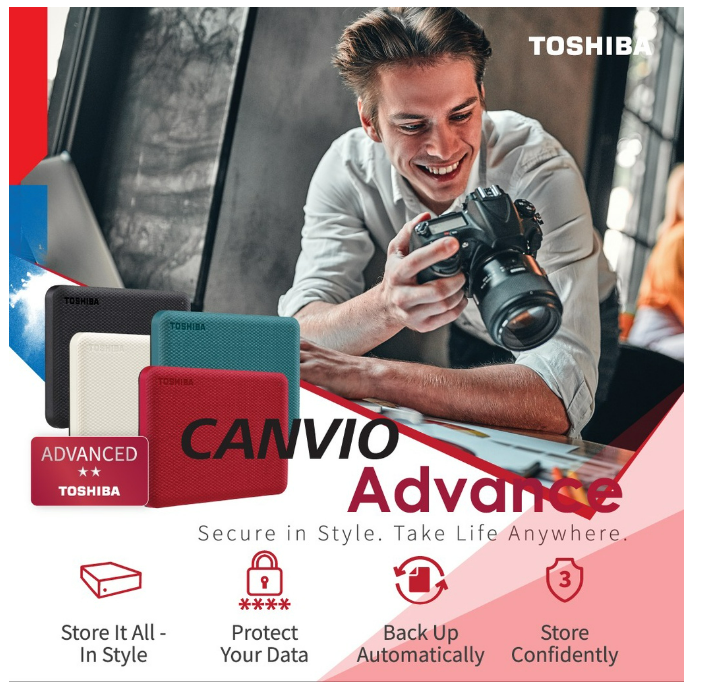 Canvio Advance เป็นโซลูชันการจัดเก็บข้อมูลที่มั่นคงสำหรับทุกคนที่ต้องการคุณภาพและสไตล์ในราคาสุดคุ้มพื้นที่จัดเก็บข้อมูลประสิทธิภาพสูงสูงสุด 4 TB บรรจุอยู่ในปลอกที่มีสไตล์มีสามสีที่แตกต่างกันเพื่อให้เข้ากับความชอบส่วนบุคคลเนื่องจากเป็นการเพิ่มมูลค่าที่แท้จริงประกอบด้วยชุดซอฟต์แวร์สำรองและซอฟต์แวร์ความปลอดภัยที่กำหนดค่าได้ง่ายเพื่อให้ข้อมูลของคุณปลอดภัย