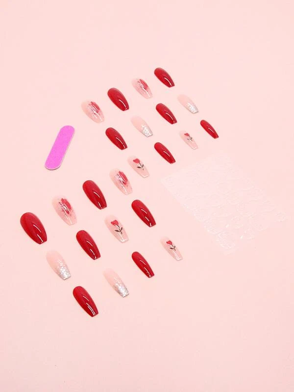 24 ชิ้น ยาว คอฟฟิน ลาย ดอกไม้ เล็บปลอม & ตะไบเล็บ 1 ชิ้น & 1 แผ่น เล็บ แถบสาย c-42