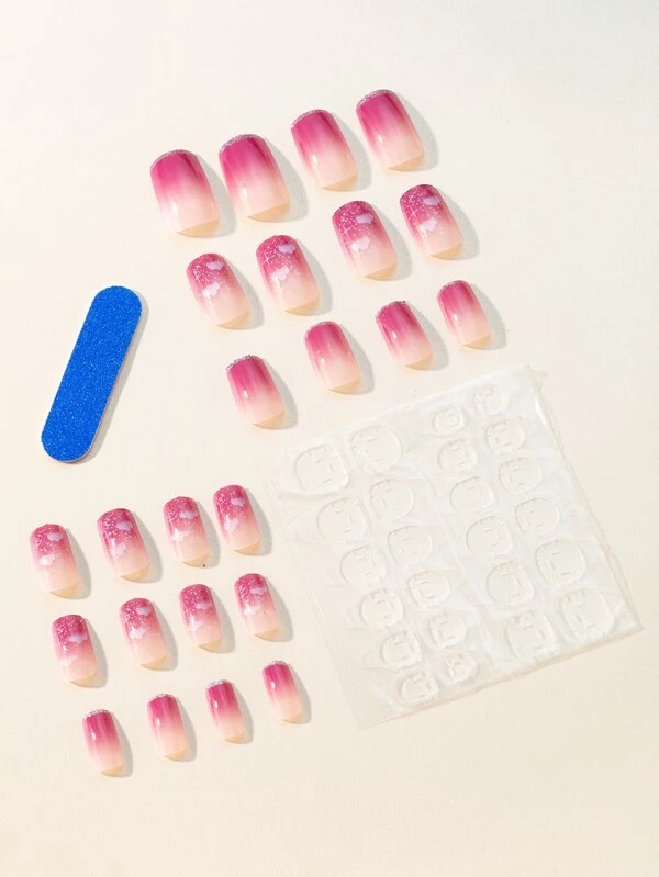 24 ชิ้น เล็บปลอม ยาว สี่เหลี่ยม บล็อคสี & ตะไบเล็บ 1 ชิ้น & 1 แผ่น เทป c-12