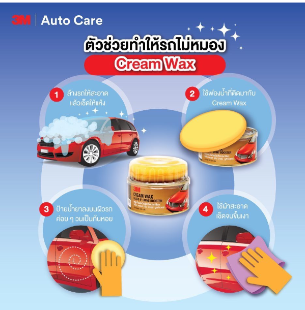 -เช็ดให้แห้งโดย 3เอ็ม ผ้าชามัวร์สังเคราะห์ ใช้ฟองน้ำที่ติดมากับ Cream Wax ป้ายน้ำยาลงบนผิวรถโดยค่อย ๆ วนเป็นก้นหอย