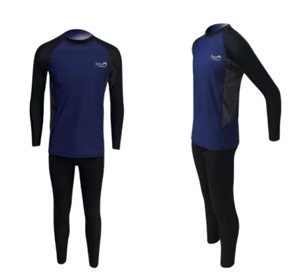 ชุดว่ายน้ำผู้ชาย ชุดว่ายน้ำเซต 2 ชิ้น เสื้อแขนยาวกางเกงขายาว แต่งแถบสีข้างๆ และแต่งพื้นสี กางเกงพื้นสีดำ กางเกงมีเชือกผูก