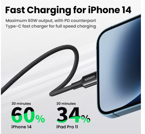 ข้อมูลเฉพาะของ UGREEN สายชาร์จไอโฟน USB C to Lightning Cable MFi Certified Apple Charging Cable สำหรับ 14 13 Pro Max iPHONE 14 Plus iPhone 12 11 Pro Max Model: 90493