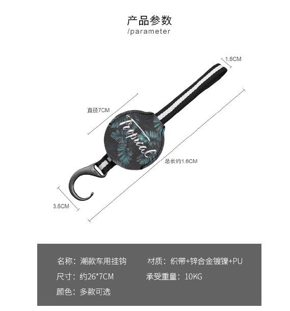 Name: Car hook Material: webbing + zinc alloy nickel plating + PU Size: about 26*7cm Withstand weight: 10kg Color: SUP red, SUP black, Little monster,Tropical Package list: 1 pair of hooks