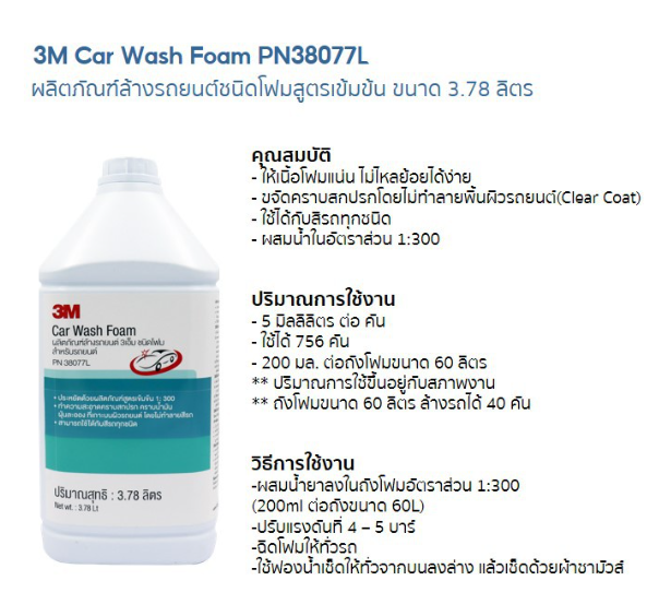 3M PN 38077L Car Wash Foam ผลิตภัณฑ์ล้างรถยนต์ ชนิดโฟม สำหรับรถยนต์ ขนาด 3.78 ลิตร >> รายละเอียดสินค้า - ให้เนื้อโฟมแน่น ไม่ไหลย้อยได้ง่าย - ขจัดคราบสกปรกโดยไม่ทำลายพื้นผิวรถยนต์(Clear Coat) - ใช้ได้กับสีรถทุกชนิด - ผสมน้ำในอัตราส่วน 1:300 >> ปริมาณการใช้งาน - 5 มิลลิลิตร ต่อ คัน - ใช้ได้ 756 คัน - 200 มล. ต่อถังโฟมขนาด 60 ลิตร ** ปริมาณการใช้ขึ้นอยู่กับสภาพงาน ** ถังโฟมขนาด 60 ลิตร ล้างรถได้ 40 คัน >> วิธีการใช้งาน -ผสมน้ำยาลงในถังโฟมอัตราส่วน 1:300 (200ml ต่อถังขนาด 60L) -ปรับแรงดันที่ 4 – 5 บาร์ -ฉีดโฟมให้ทั่วรถ -ใช้ฟองน้ำเช็ดให้ทั่วจากบนลงล่าง แล้วเช็ดด้วยผ้าชามัวส์