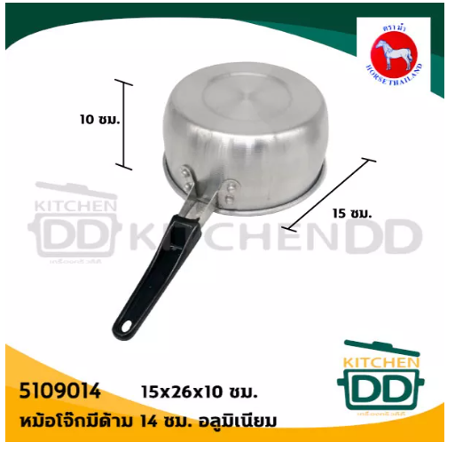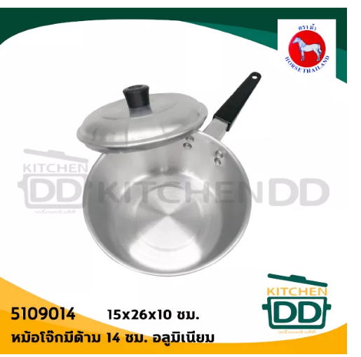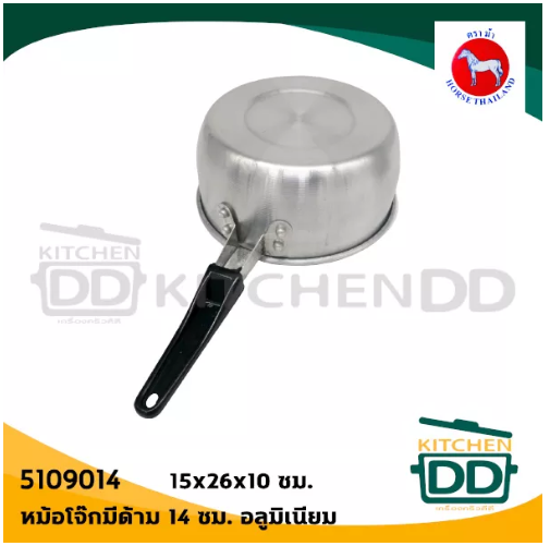 หม้อด้าม หม้อด้ามมีฝา หม้อโจ๊ก หม้อโจ๊กมีด้าม หม้อโจ๊กมีฝา 14 ซม. 15x26x6.5 ซม. อลูมิเนียม ตราม้า ม้าแดง 5109014 - ใบ