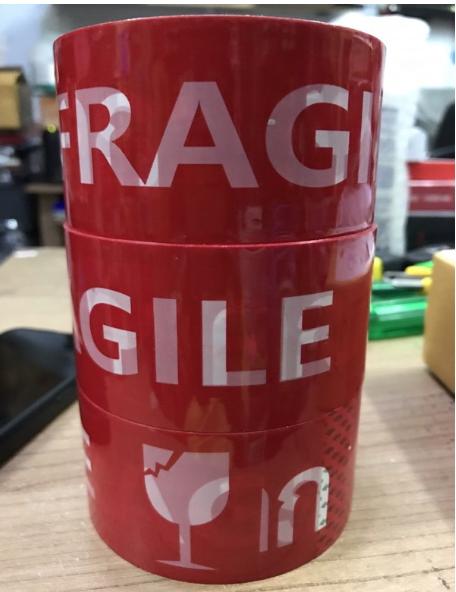 เทประวังแตก ขนาดกว้าง 2” ยาว 45 หลา เนื้อทปสีขาว ตัวหนังสือระวังแตกสีแดง ภาษาไทย แปะกล่องแล้วเห็นเด่นชัดมาก กาวเหนียว ติดแน่นมาก