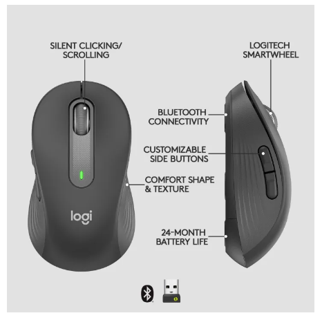 ข้อมูลเฉพาะของ Logitech Signature M650L Wireless Mouse Bluetooth and USB - Graphite ( เมาส์ไร้สายสำหรับมือขนาดใหญ่ )