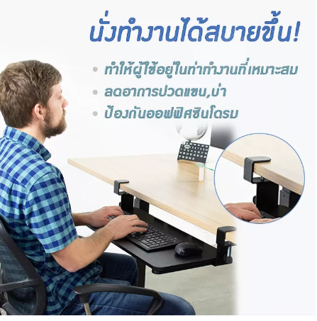 - ถาดวางคีย์บอร์ดใต้โต๊ะ ช่วยให้พิมพ์งานได้สบายขึ้้น ลดอาการเกร็งกล้ามเนื้อแขนและบ่า ช่วยให้ผู้ใช้งานอยู่ในท่าทำงานที่เหมาะสม วัสดุ MDF มีความแข็งแรงทนทาน สามารถเคลื่อนย้ายได้