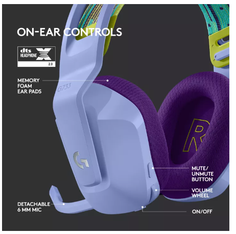 • G733 มีน้ำหนักเพียง 278 กรัมเพื่อความสบายที่ยาวนาน มีให้เลือกหลายสี แต่ละสีมีแถบคาดศีรษะแบบพลิกกลับได้อันสดใสและแผ่นรองหูฟังที่สอดคล้องกัน