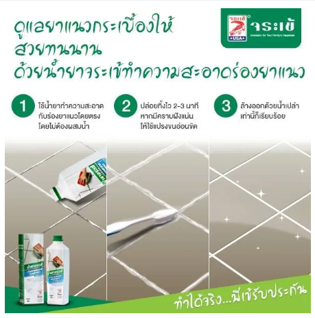 น้ำยาจระเข้ ทำความสะอาดร่องยาแนวทำความสะอาดคราบในร่องยาแนวให้กลับมาสวยสะอาดอย่างมีประสิทธิภาพด้วย "น้ำยาทำความสะอาดร่องยาแนวจระเข้" สามารถใช้ได้ทั้งในห้องน้ำ ห้องครัว ห้องนั่งเล่น หรือห้องนอนโดยไม่ทำลายพื้นผิวกระเบื้องเหมาะสำหรับกระเบื้องที่มีการเคลือบผิวหน้า หรือกระเบื้องเคลือบเงาอัตราส่วนผสมไม่ต้องผสมน้ำการใช้งาน