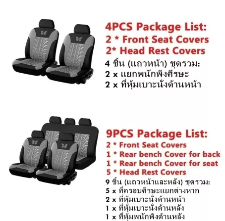 4 ชิ้น (แถวหน้า) ชุดรวม: 2 x แยกพนักพิงศีรษะ 2 x ที่หุ้มเบาะนั่งด้านหน้า OR/หรือ 9 ชิ้น (แถวหน้าและหลัง) ชุดรวม: 5 x ที่ครอบศีรษะแยกต่างหาก 2 x ที่หุ้มเบาะนั่งด้านหน้า 1 x ที่หุ้มเบาะนั่งด้านหลัง 1 x ที่หุ้มพนักพิงด้านหลัง