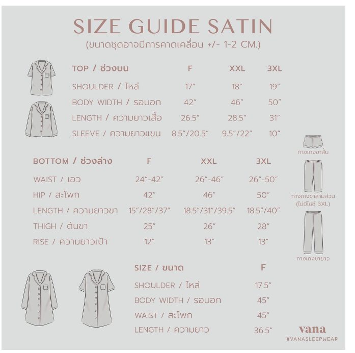 Satin pattern collection ชุดนอนของเราผลิตจากผ้าซาตินแท้ คุณภาพดี ที่เน้นความเย็นสบายเหมาะกับสภาพอากาศที่ร้อน Our satin pajamas are made from finest quality satin. ทรงชุดนอน /Styles - แขนสั้นขาสั้น / Short sleeve with shorts - แขนสั้นขาสามส่วน / Short sleeve with three quarter legs - แขนสั้นขายาว / Short sleeve with pants - แขนยาวขายาว / Long sleeve with pants - กระโปรงแขนสั้น / Short sleeve dress - กระโปรงแขนยาว / Long sleeve dress วิธีการซัก / Fabric Info - ซักด้วยน้ำอุณหภูมิปกติ / Wash with room temperature - ห้ามบิด / Do not bleach - ใส่ถุงซักผ้าหากซักเครื่อง / Best with mesh laundry bag - ควรซักด้วยน้ำยาซักผ้าสี / Best with colored laundry detergent **ทางร้านขอสงวนสิทธิ์ในการคืนเงินและการคืนสินค้า** **We reserve the right to refuse a return on any product.**