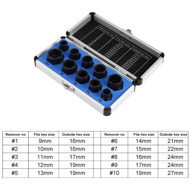 SX08 ชุดน้อตถอนเกลียวหัวน็อตเสีย 10 ชิ้น สำหรับ ถอดน็อค หัวเหลี่ยม หัวจม ทุกชนิดที่มีหัวโผล่ออกมา****** ใช้สำหรับงานซ่อมแซม ถอนน็อตที่ถอดไม่ออก หัวเสียเหลี่ยม หรือสตรัท ที่ประแจหรือบล็อคไม่สามารถจับลุกบล็อคได้******ใช้สหรับถอนน็อตออกเท่านั้น ไม่สามรรถขันเข้าได้ในชุดประกอบด้วย- บล็อคถอนน็อตหัวเสียเกลียซ้าย 10 ชิ้น เบอร์ 9 ,10 ,11,12,13,14,15,16,17 และ 19 มิล- ตัวล็อคบล้อคถูกออกแบบให้เป็นเกลียว ซ้าย แบบมีเทเปอร์ มีคมสำหรับจิกน็อคที่หัวเสีย ยิ่งดันลึกยิ่งแน่น- ผลิตจากโลหะ อัลลอยคุณภาพสูง สำหรับงานหนัก งานซ่อมแซมเครื่องจักร รถยนต์- รูในขนาด 3/8 สามารถใช้ร่วมกลับบล็อค 3/8 ได้ หรือใช้ประแจปากตาย ประแจแหวนล็อค เพื่อจับลลูกบล็อค- มาพร้อมกล่องใส่อลูมิเนียม ป้องกันลูกบล็อคหาย