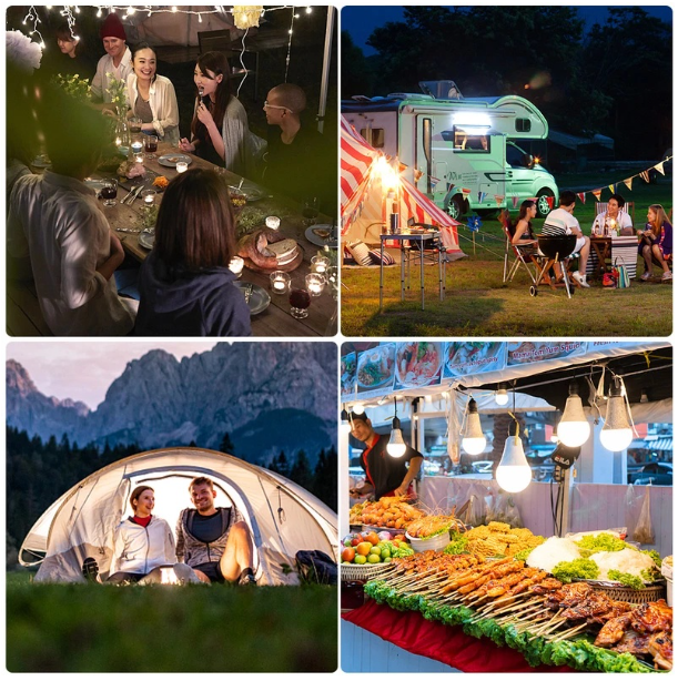 Rechargeable mobile light bulb, night market stalls, power outage emergency, outdoor adventure.