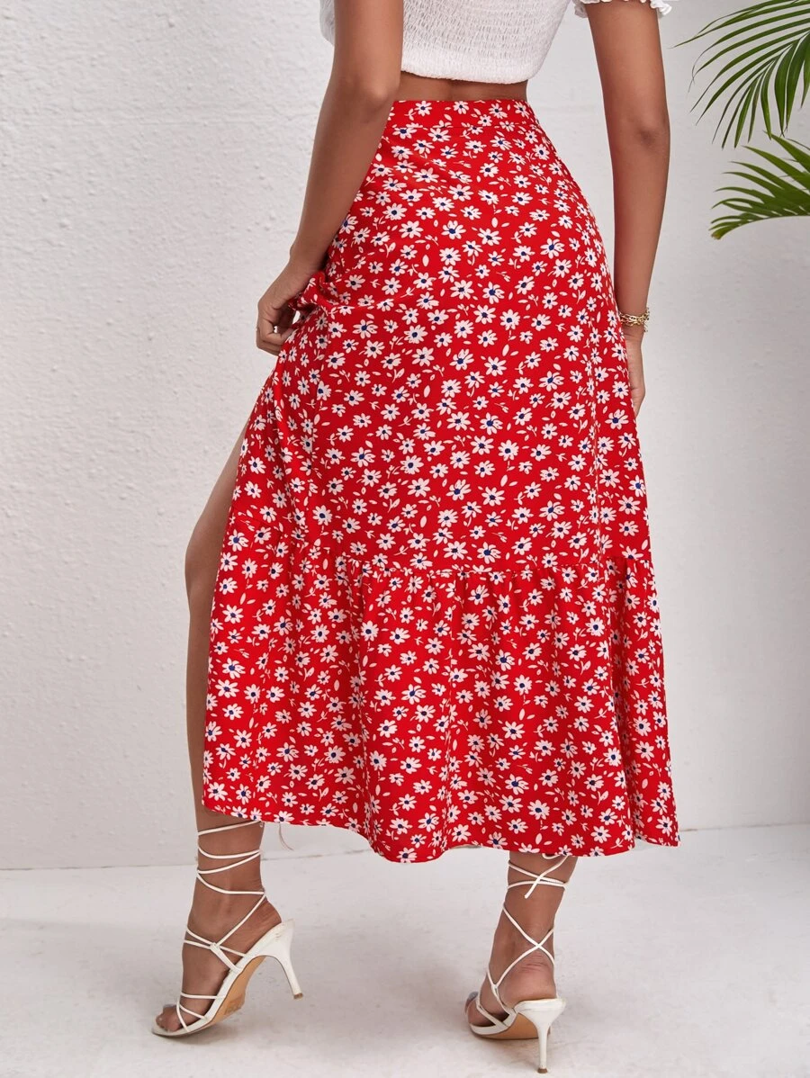 VCAY กระโปรง ลายดอกไม้ขนาดเล็ก ผ่าลึก ชายระบาย