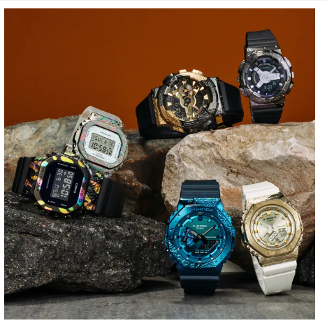 Chart your own course with a G-SHOCK 40th Anniversary Adventurer’s Stone limited-edition timepiece. Join us in celebrating the G-SHOCK 40th by choosing one of these spectacular metal-clad watches, which are inspired by the stones adventurers have used to navigate since ancient times. The special colors of the minerals ancient seafarers used to find their way are reproduced in these watch designs with forging, ion plating, and masking processes, giving each metal bezel a one-of-a-kind look. The bands are made with colored or translucent resin and are uniquely textured with hot-stamping and Garal color molding techniques. These limited-edition timepieces celebrate the G-SHOCK 40th through and through: the phrase “SINCE 1983” appears on the dial; the Eric Haze-designed 40th logo is engraved on the case back, and there are four stars for 40 on the band loop.